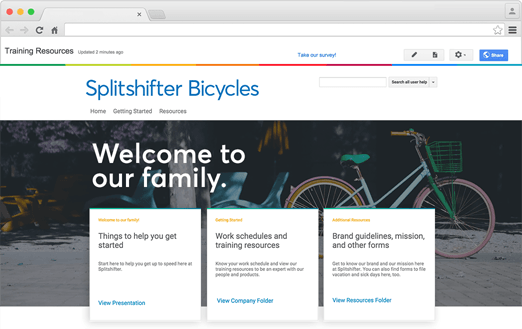 - Create a single Sites website that shares internal news and blog posts and links to your project schedules, product documents, promotional materials, online forms and training content.